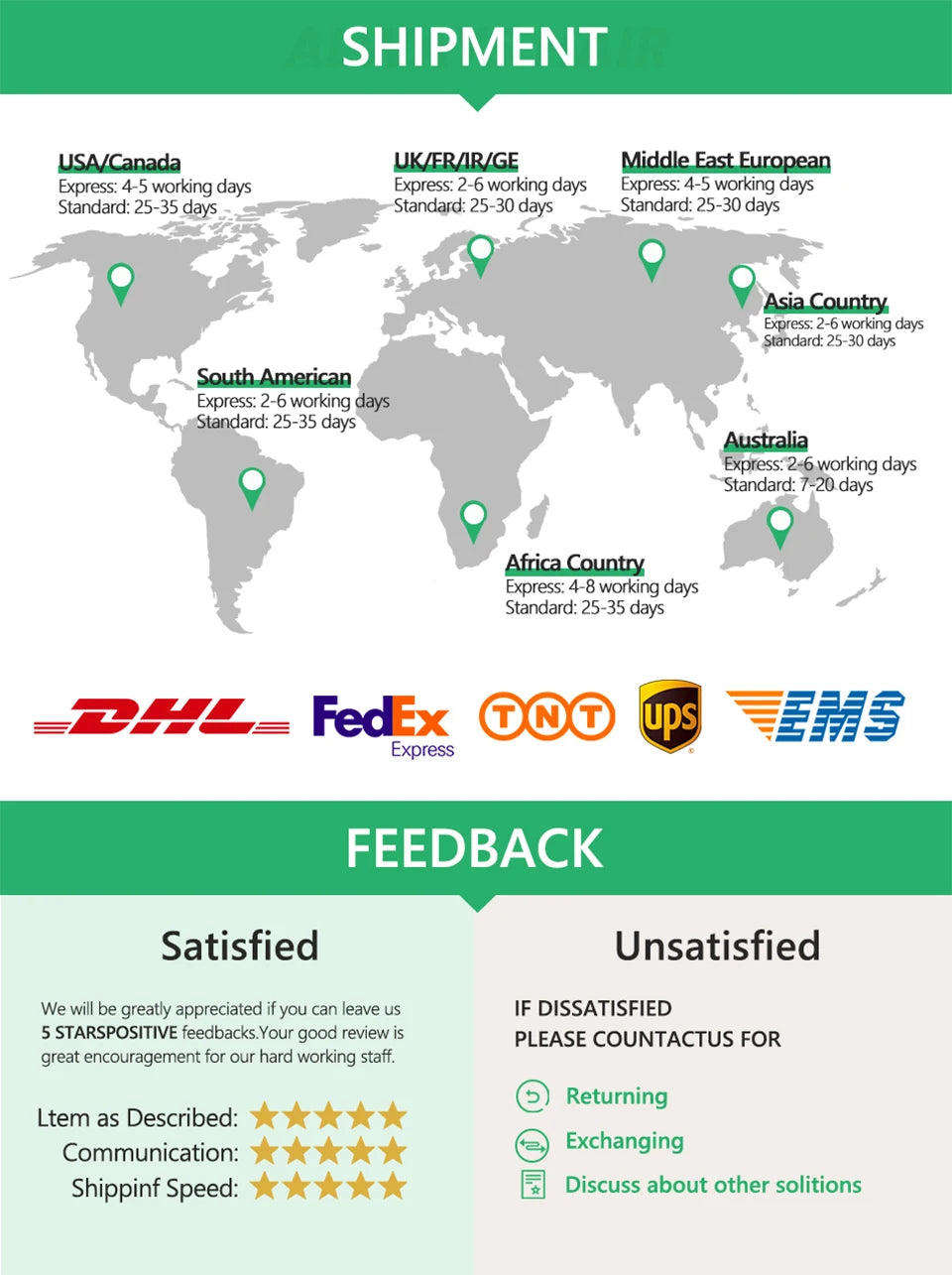 Will be greatly apprieciated if you can leave us 5 stars positive feedback with pictures. Your good review is great rencouragen ment for our hard working staff. If you are not satisfied. Please CONTACT US in time , we will try our hardest to work with you together to solve any problem until you get !