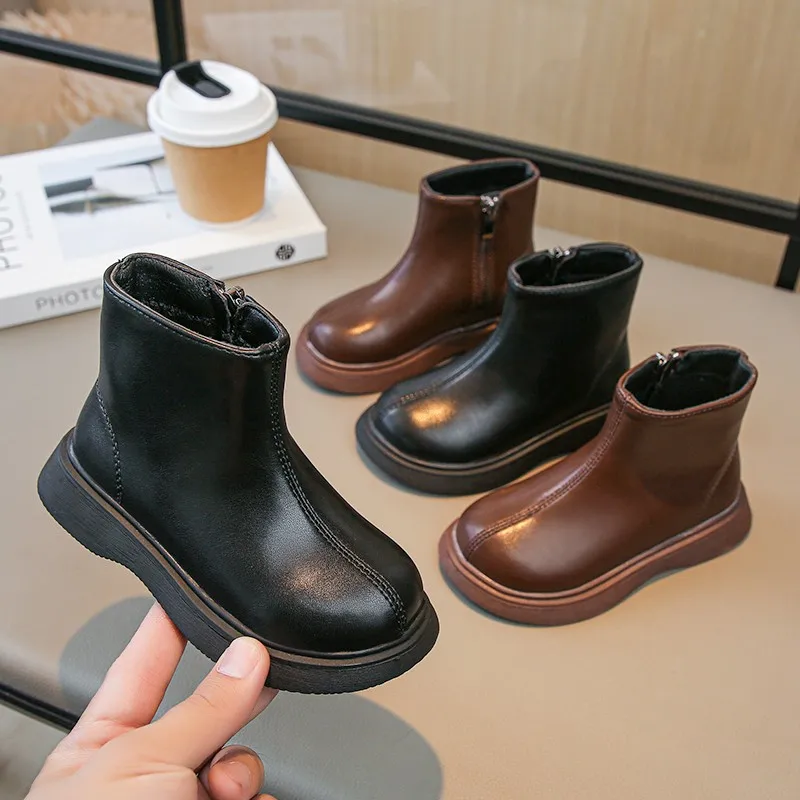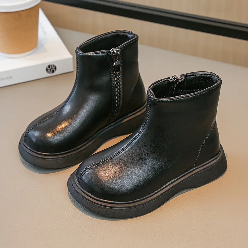Children Fashion Boots Simple Girls Ankle Boot Black Kids Short Leather Boots Side Zipper Thick Bottom Autumn Winter 2024 New