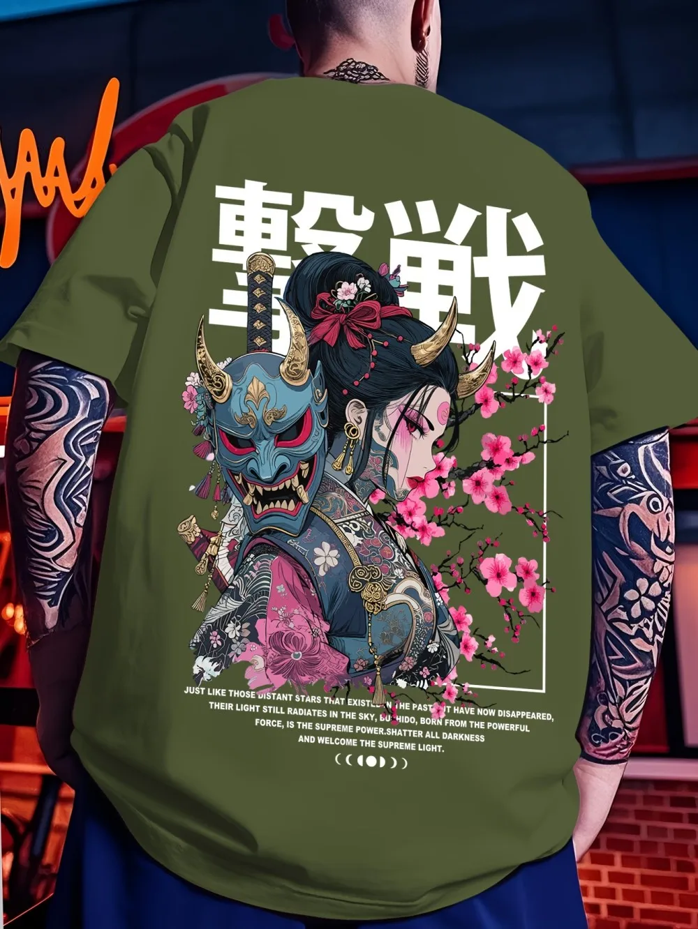 European and American men's summer ghost warrior cherry blossom print soft and breathable round neck T-shirt outdoor street top