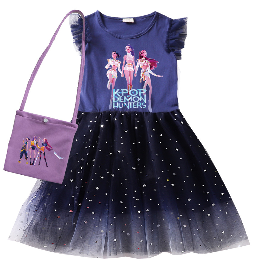 KPop Demon Hunters Clothes Kids Short Sleeve Casual Dress Baby Girls Lace Dress with Small Bag Children Wedding Party Vestidos