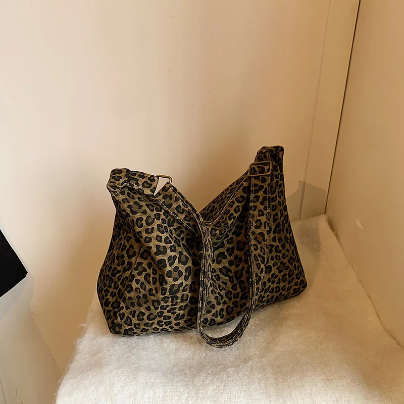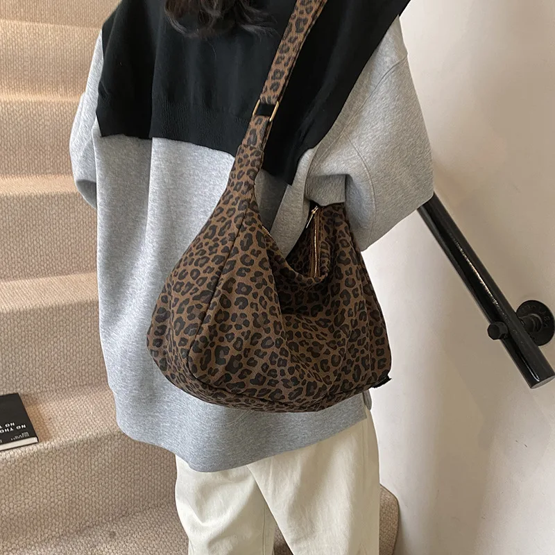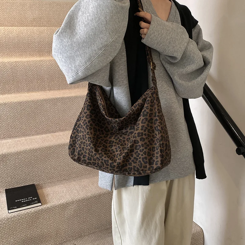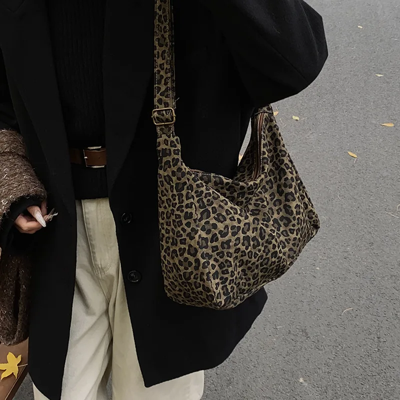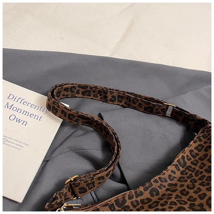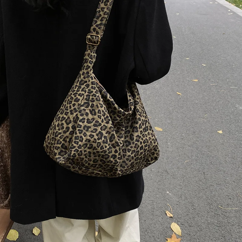Trendy Casual Soft Textile Women's Shoulder Bag Large Capacity Leopard Print Female Retro Crossbody Bag For Commute Outings